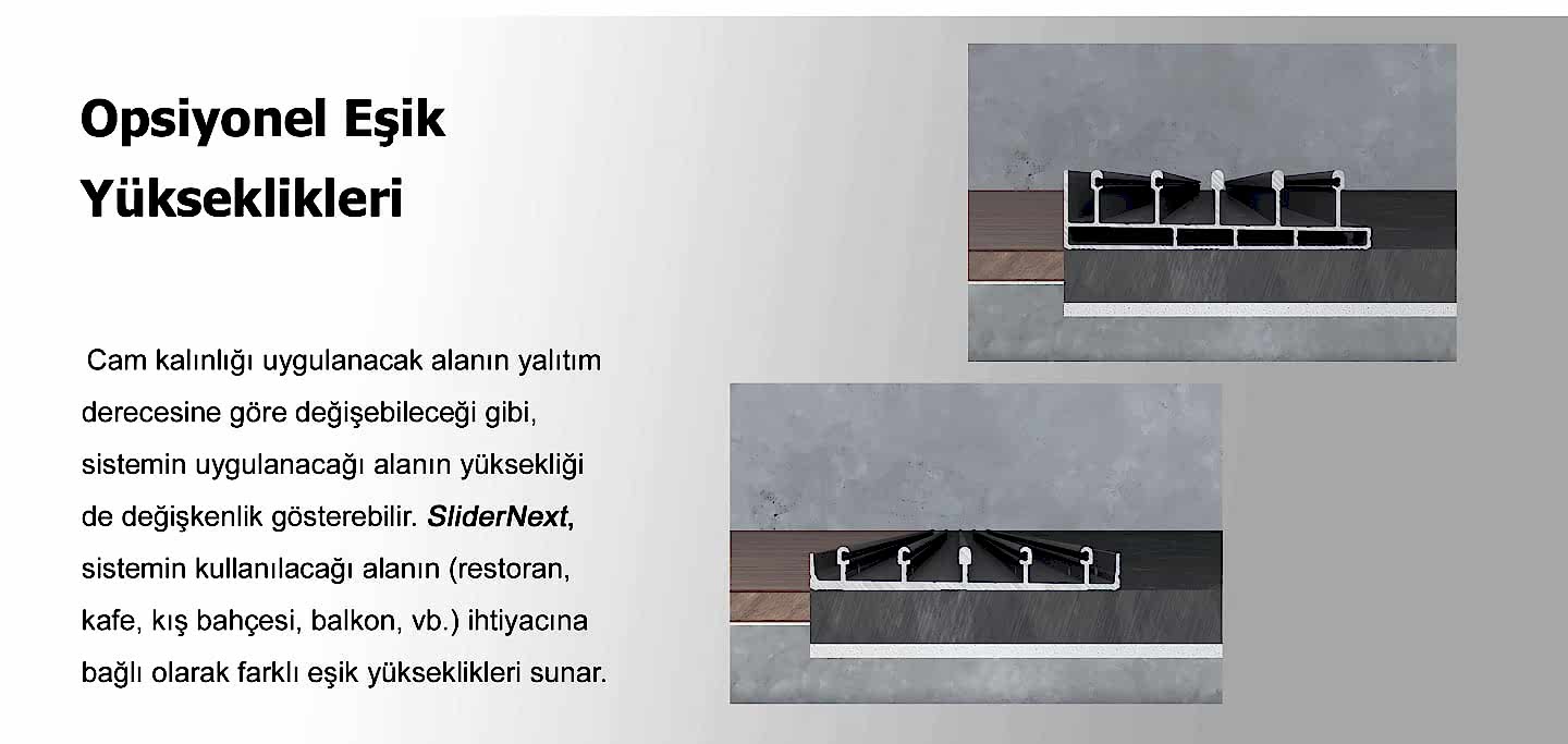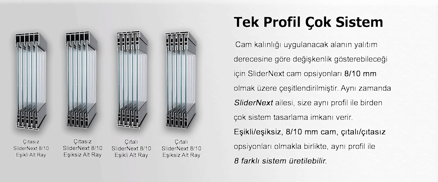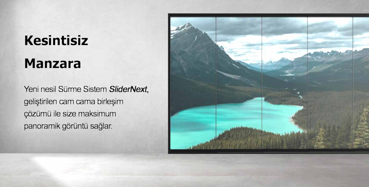 SliderNext diğer sürme sistemlerin aksine tüm panellerin birbirinden bağımsız hareket edebildiği bir tasarıma sahiptir. Dolayısıyla, tüm camlar üst üste gelme problemi olmadan kolaylıkla ve 100% temizlenir.